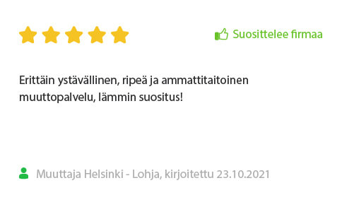 Muuttopalvelumme sisältää kokonaisvaltaisesti kaiken, mitä tarvitset uuteen kotiin muuttamisessa. Tämä tarkoittaa sitä, että huolehdimme muun muassa tavaroiden suojauksesta ja pakkaamisesta, kierrätettävien huonekalujen tai muiden tavaroiden kierrättämisestä sekä mahdollisen loppusiivouksen järjestämisestä. Kanssamme ei tarvitse erikseen sopia isojen huonekalujen purusta taikka tarvittavien työvälineiden käytön lisäveloituksesta, sillä haluamme antaa sinulle sujuvan palvelukokemuksen. Palvelumme on täten läpinäkyvää, eikä sisällä piilokuluja - maksat siis vain sinulle tarpeellisesta palvelusta.